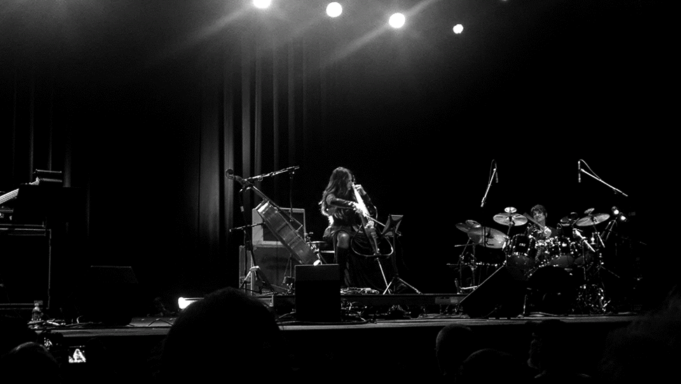 Maya Beiser performing "Uncovered" live at Big Ears 2017 with Glenn Kotche (drums) and Gyan Riley (bass), photos by Pete Eby