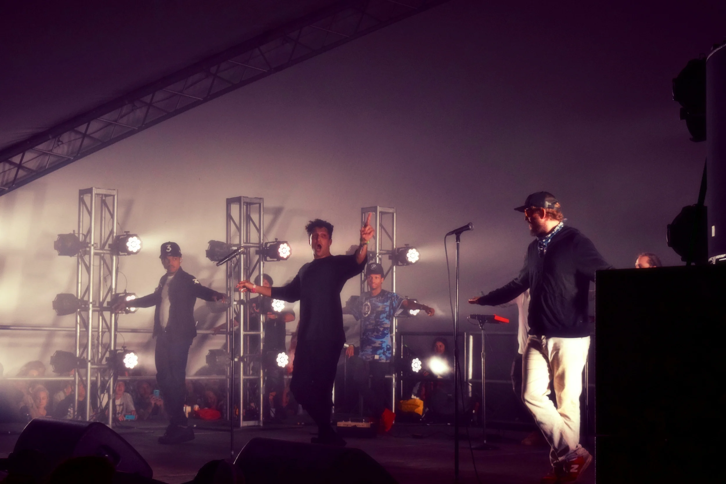 (Left to right) Chance the Rapper (surprise guest), Francis and the Lights and Justin Vernon perform "Friends" together during Francis's set at Eaux Claires 2016, photograph by Anmol Gupta